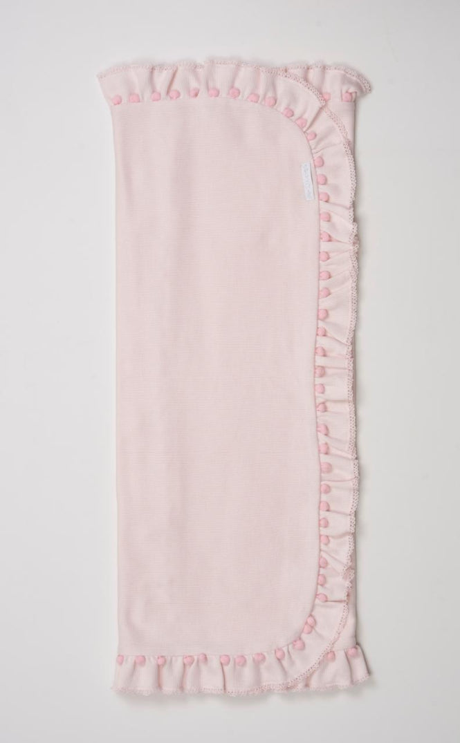 Manta Rosa Coordenada: Manta de tamanho ideal (aproximadamente 80x80cm), na mesma malha tricotada e cor do macacão, perfeita para envolver e aquecer o bebê com suavidade.