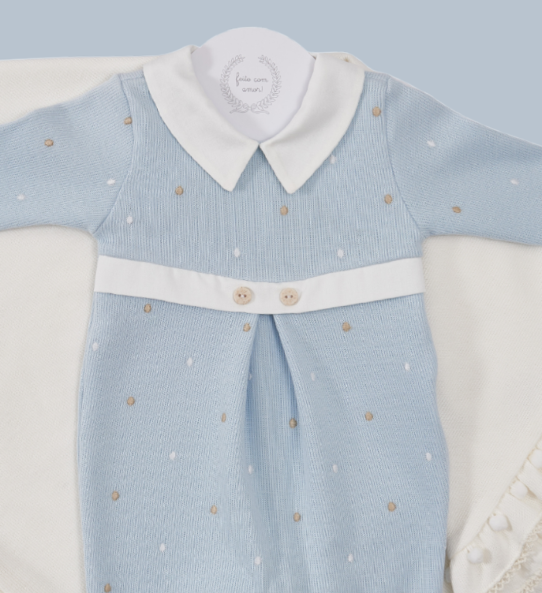 Apresentamos a escolha perfeita para o primeiro momento especial do seu bebê: a Saída Maternidade que une a nobreza do tricot à suavidade inigualável do algodão 100%.